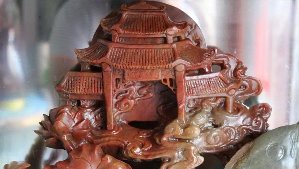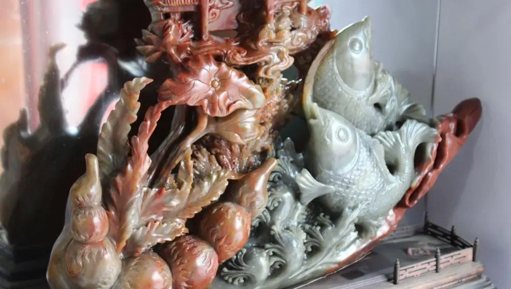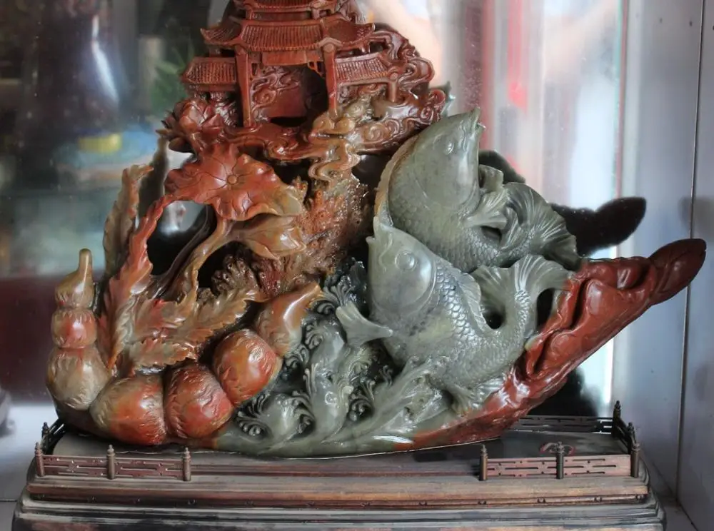 BEST SELLER 24" Natural ShouShan Stone Handmade Dragon Door Fish Fishes Lotus Sculpture