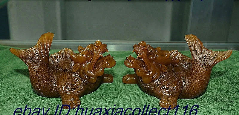 HIGH QUALITY 4"China Dynasty Palace Shoushan Stone Fengshui Good Luck Dragon Fish Statue Pair