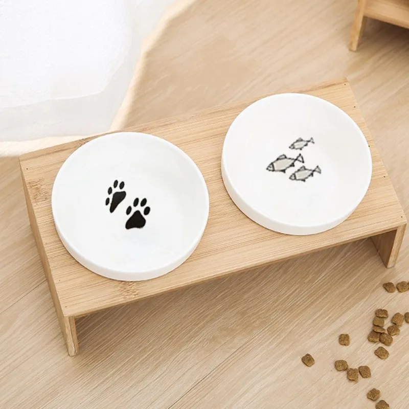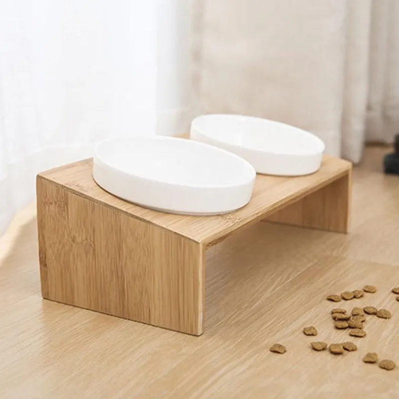 Pets Double Bowl Dog Cat Food Water Feeder Stand Raised Ceramic Dish Bowl Wooden Table Pet Supplies